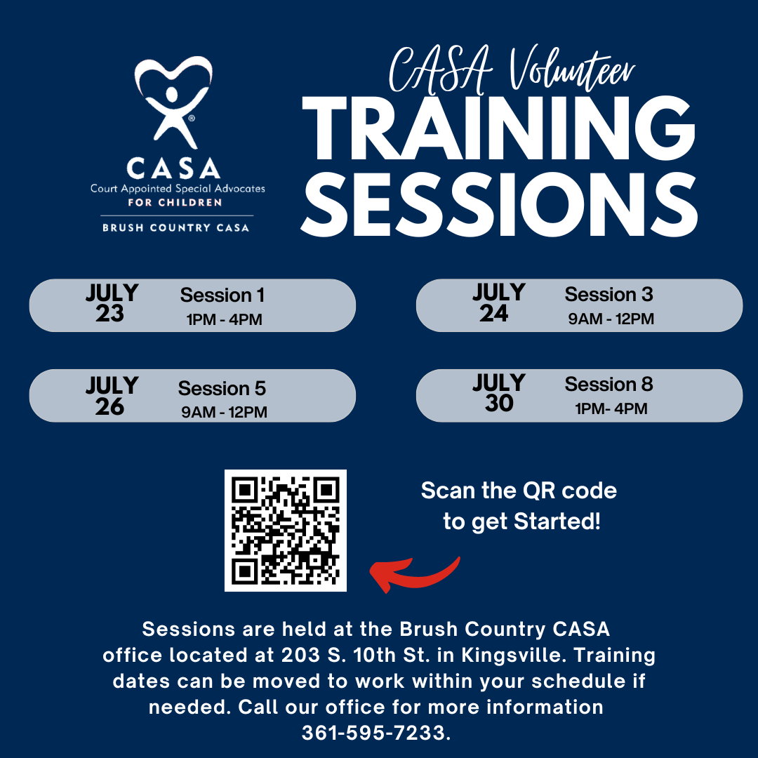 Brush Country CASA will be hosting a free pre-service training in July. The training is geared towards teaching incoming volunteers about the role CASA plays in the judicial system and in the life of children and families who are involved in the child welfare system. The class is now a blended curriculum which consists of 4 in person training classes and 4 online sessions that may be completed at home.