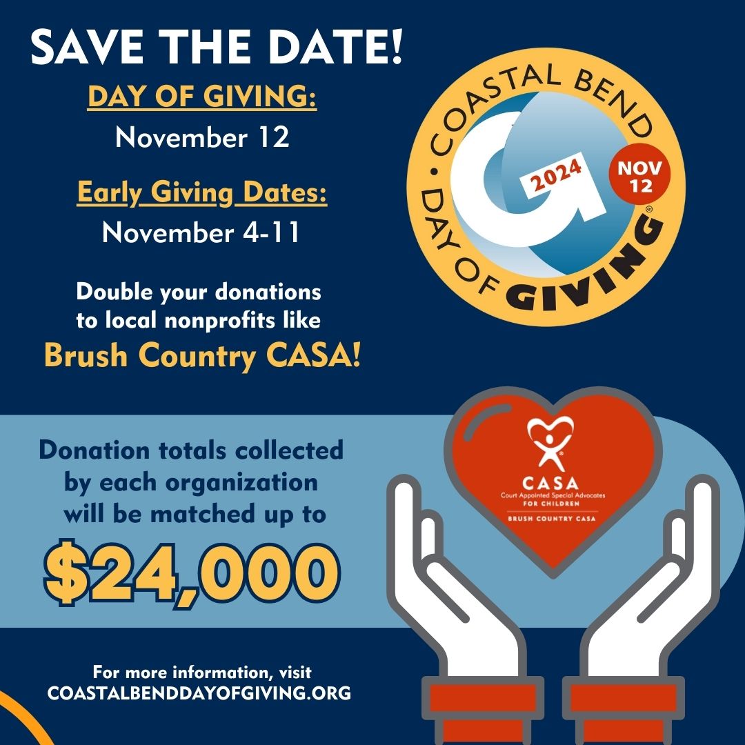 Brush Country CASA is pleased to announce that we are one of 62 nonprofit organizations participating in this year’s Coastal Bend Day of Giving on November 12th! This year, funders will match up to $1.5 million, or $24,000 per organization. That means your donation will be DOUBLED, giving organizations the opportunity to raise more than $48,000 in only 24 hours! Support many local nonprofits, like Brush Country CASA, by making plans to donate in November.